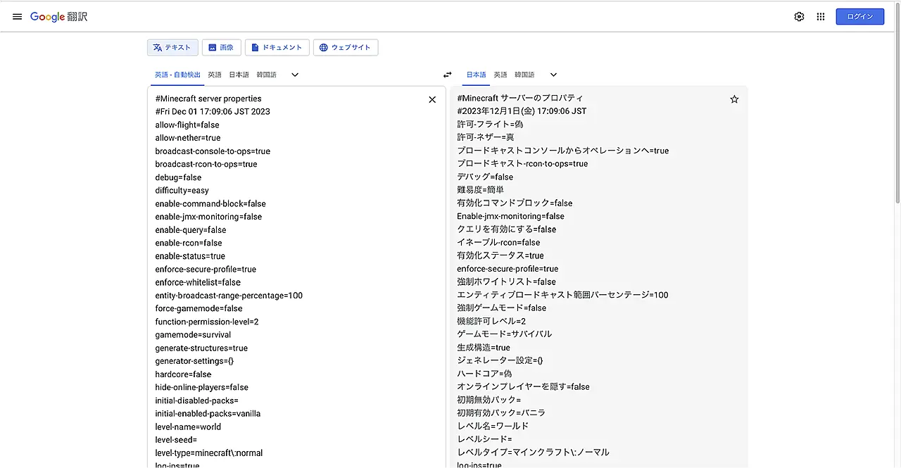 同じフォルダに入っている「server.properties」をテキストエディタで開き、サーバーの設定をします。翻訳サイトを使うとわかりやすいです。※Windowsの場合はフォルダー...。伸ばします。2024-7現在、英語では翻訳されないのでドイツ語を選択してください。