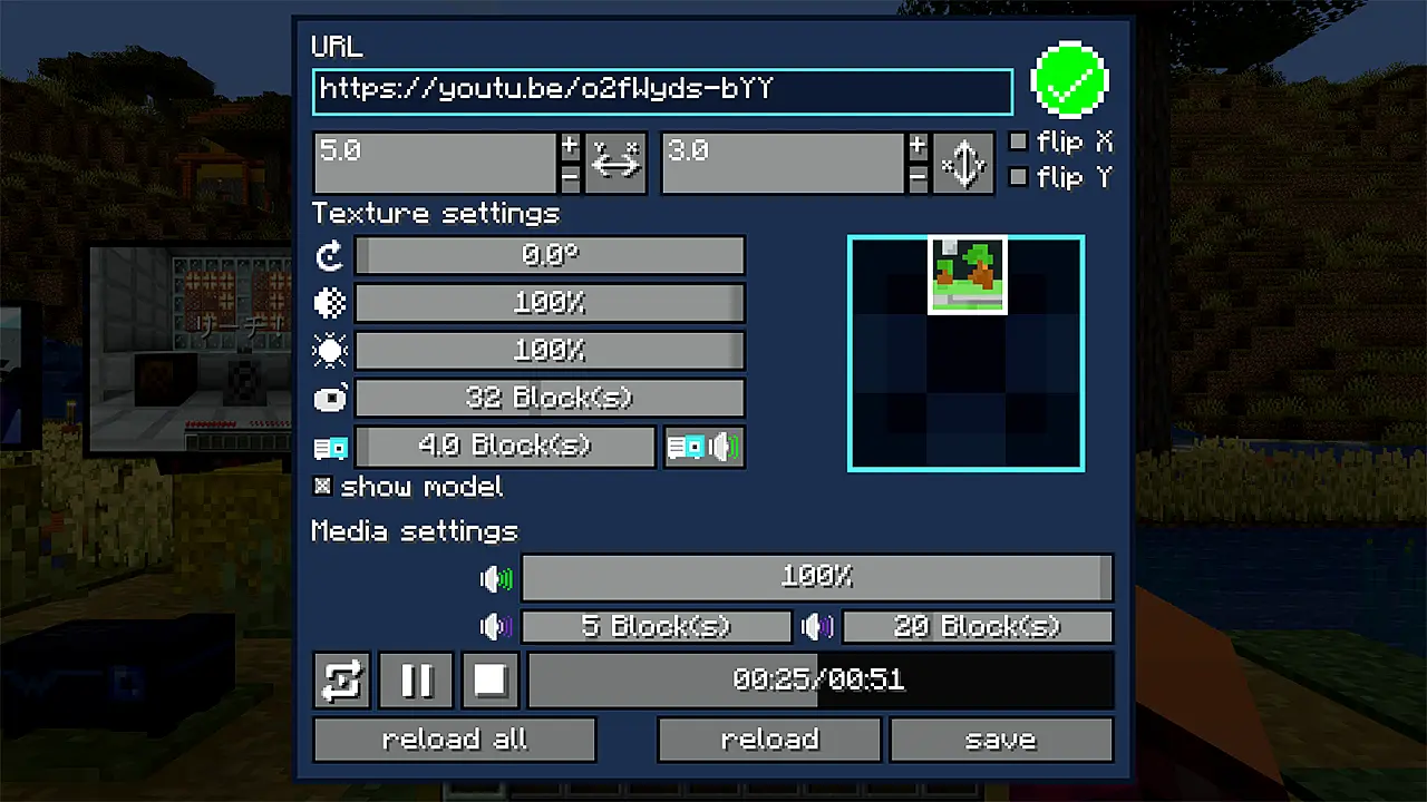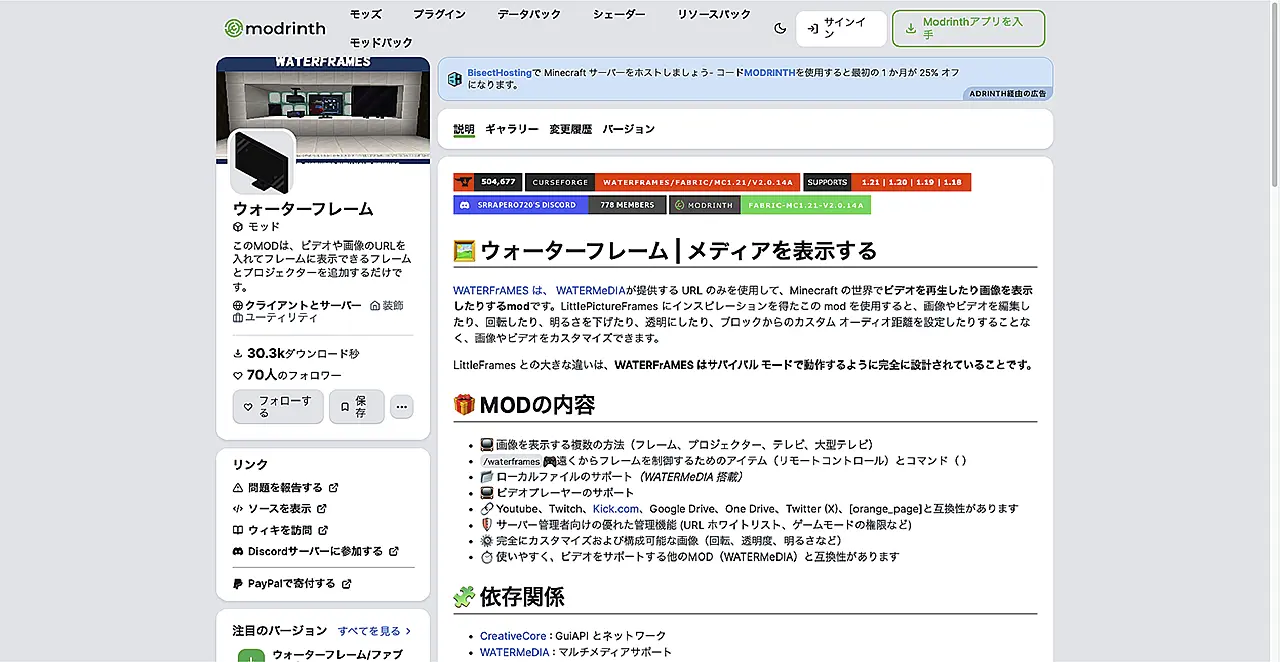 マインクラフトのワールド内で、画像を表示したり、動画や音楽を再生出来るモッドです。シングルプレイ用のモッドは過去にもありましたが、WATERFrAMES(ウォーターフレーム)では、URLを使って同じYouTube動画を、マルチプレイで一緒に見ることが出来ます。クライアントはもちろん、サーバーにも設置出来るようです。