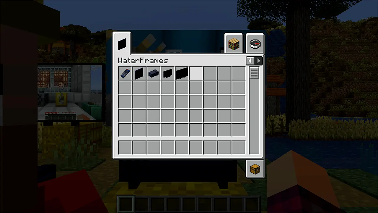 インベントリにトグルスイッチと、WATERFrAMES(ウォーターフレーム)のブロックが追加されます。4つのモニターがあるので、好きなモニターを設置します。※パソコンの性能にもよりますが、複数設置も出来ます。