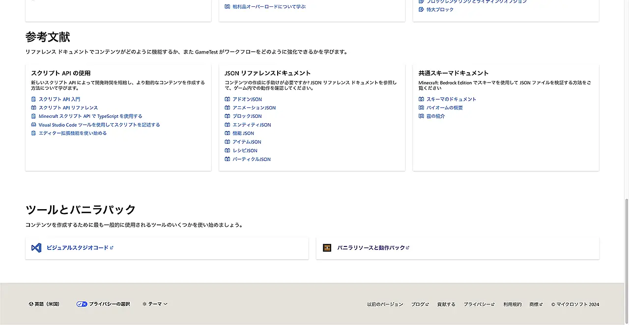 Minecraft: Bedrock Edition クリエイター ドキュメント/WEBサイト。