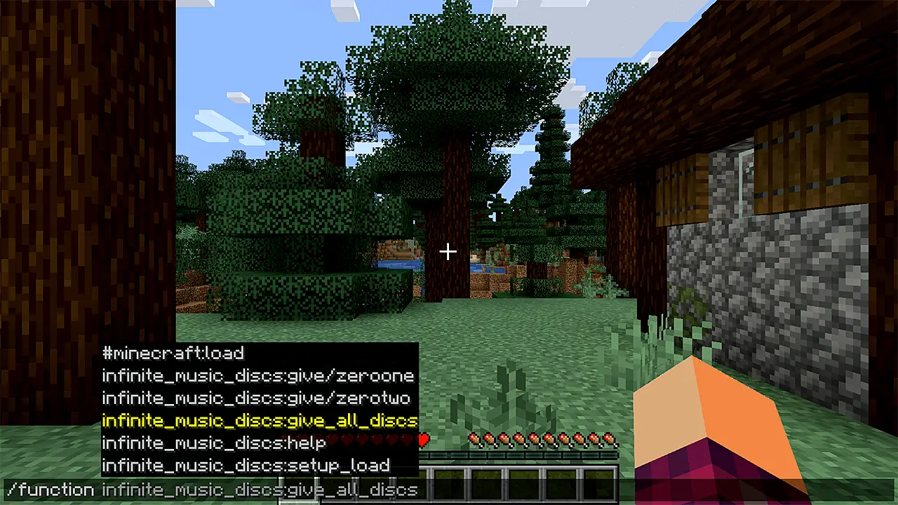 データパックを使用時、コマンド「function」からパック名:give_all_discsを選択すると、全ての曲のカスタムディスクを、まとめて入手出来ます。通常のレコードと同じように使えます。