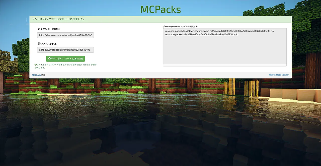 ダウンロードURLとSHA-1ハッシュが作成されるので、サーバーの設定ファイル「server.properties」に追加します。※SHA-1ハッシュ値は無くても動作します。ファイルに破損や異常があった時、エラーで知ることが出来ます。