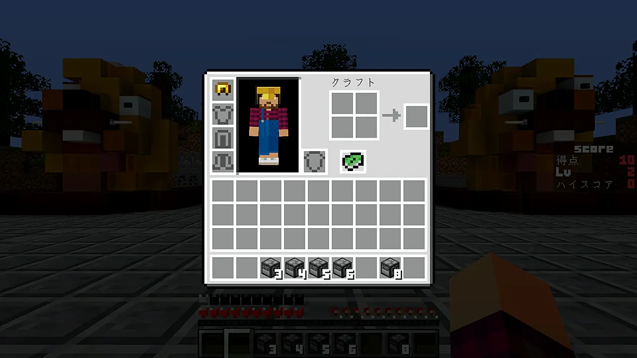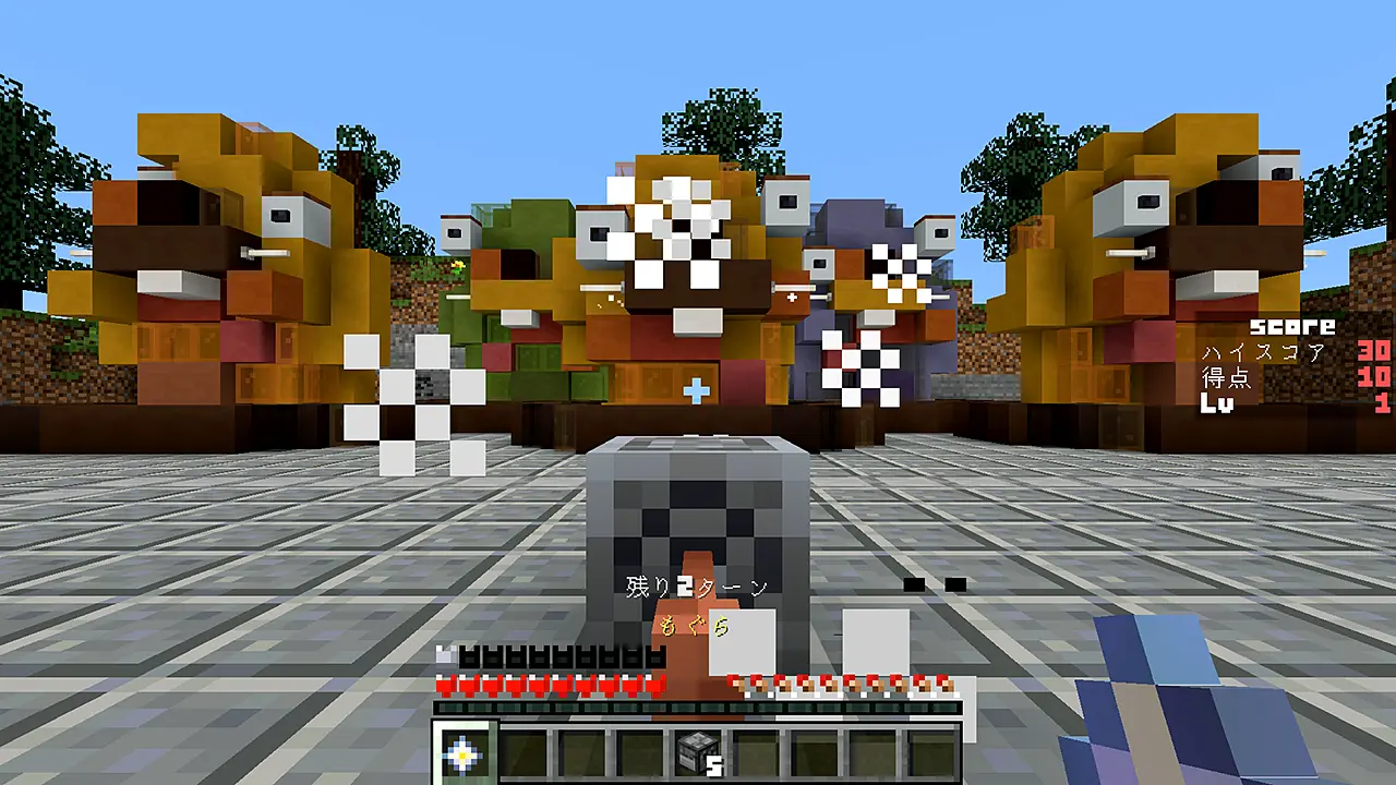 ホットバーに現れるもぐら(ドロッパー)を選択。スニークすると得点が入ります。地面にも、もぐらとハンマーが表示されます。※キーボード、またはコントローラー推奨。