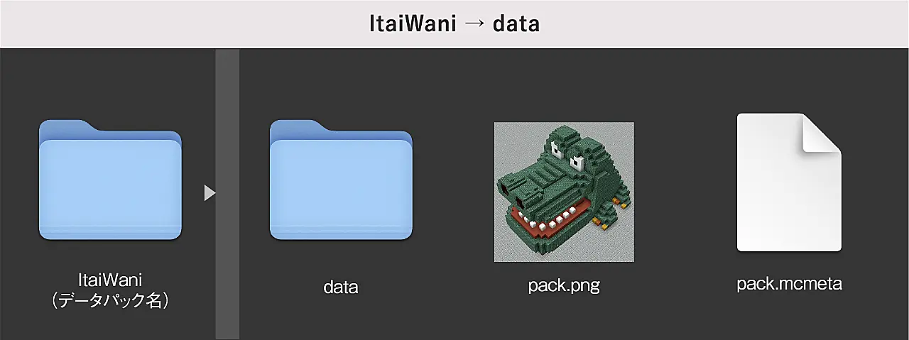 ②その中に、フォルダ名「data」、「pack.mcmeta」「pack.png」を入れます。