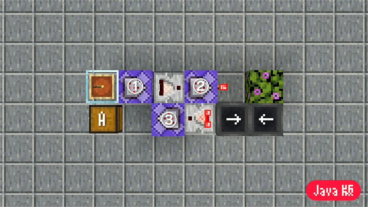 Java版では、オフハンドに持った松明を設置する事が出来ます。また、プレイヤーが装置から離れていても動作します。