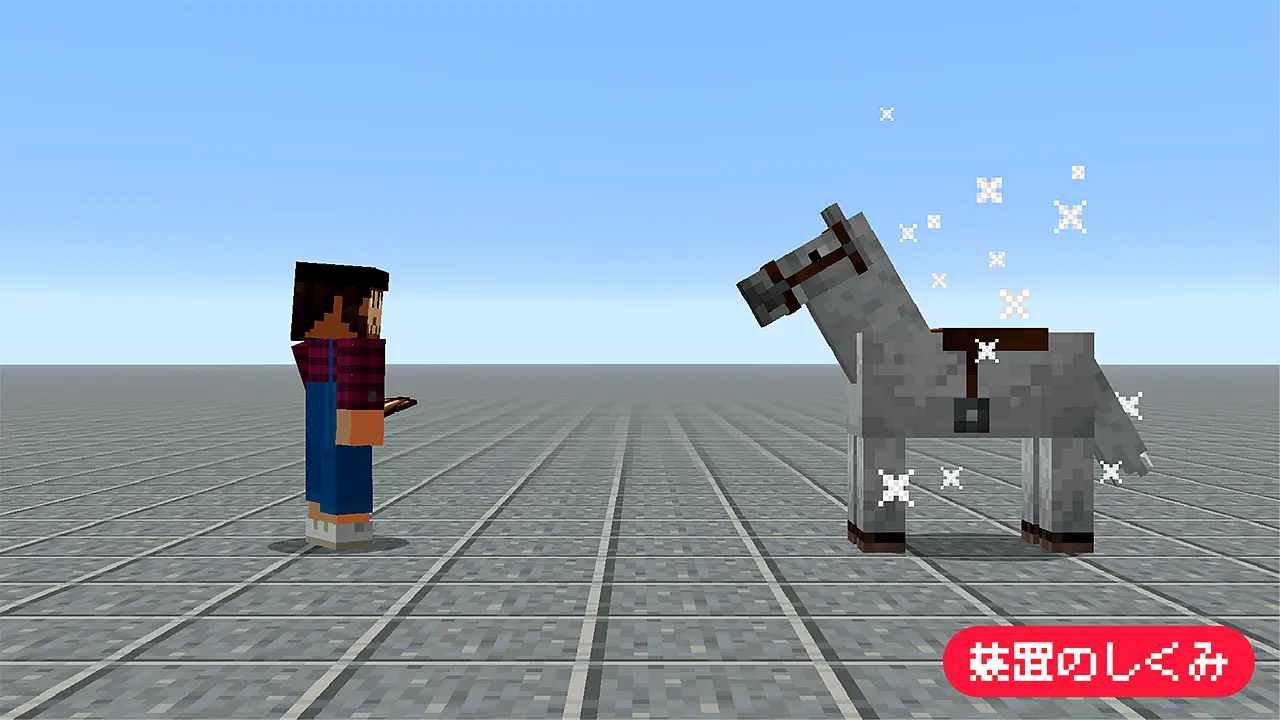 「ウマのスポーンエッグ」をオフハンド(統合版はメインハンド)に持ちスニークした時、その場に「馬神」を召喚。プレイヤーの近くにいる時、速さとジャンプ力を強化。パーティクルを使って光らせます。マルチプレイでは、最初に「馬神」を召喚したプレイヤーが優先になります。「馬神」は召喚したプレイヤーから離れると効果が消滅。スポーンエッグをオフハンドから外すと帰還します。